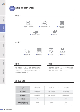 05 A-MODULAR%u92c1%u64e0%u578b%u6a21%u7d44%u4ecb%u7d39%u4fbf %u5229T%u578b%u51f9%u69fd%u4e4b%u6a19%u6e96%u5316%u92c1%u5408%u91d1%u7d50%u69cb%uff0c%u642d%u914d%u5b8c%u6574%u7684%u6a21%u7d44%u5316%u96f6%u914d%u4ef6%uff0c%u4e0d%u9700%u8003%u616e%u7d44%u88dd%u7684%u9806%u5e8f%u53ca%u9810%u5148%u52a0%u5de5%uff0c%u5373%u53ef%u5feb%u901f%u7d44%u88dd%u51fa%u60a8%u7684%u9700%u6c42%u3002%u6750 %u8cea%u4f7f%u7528%u8cea%u8f15%u9ad8%u525b%u6027%u7684%u92c1%u5408%u91d1 A 6 N 0 1 S -T 5%uff0c%u7d93%u967d%u6975%u8655%u7406%u5176%u5f37%u5ea6%u53ca%u786c%u5ea6%u53ef%u6bd4%u64ec A 6 0 6 1 -T 6%u3002%u92c1%u5408%u91d1%u6750%u8cea%u7279 %u9ede%u7528 %u9014%u6750%u8cea A6N01S-T5 A6063-T5 A6061-T6%u6297%u62c9%u5f37%u5ea6 25.0 kgf/mm2 16.0 kgf/mm2 27.0 kgf/mm2%u964d%u4f0f%u5f37%u5ea6 21.0 kgf/mm2 11.0 kgf/mm2 25.0 kgf/mm2%u4f38%u5f35%u7387 8%uff05 8%uff05 8%uff05%u8868%u9762%u786c%u5ea6%uff08%u52c3%u6c0f%uff09 80HB 60HB 80HB%u516c%u53f8%u7c21%u4ecb%u6280%u8853%u8cc7%u6599%u5171%u7528%u914d%u4ef6%u5e38%u7528%u914d%u4ef6L%u578b%u89d2%u92c1M4%u7cfb%u5217M6%u7cfb%u5217M8%u7cfb%u5217